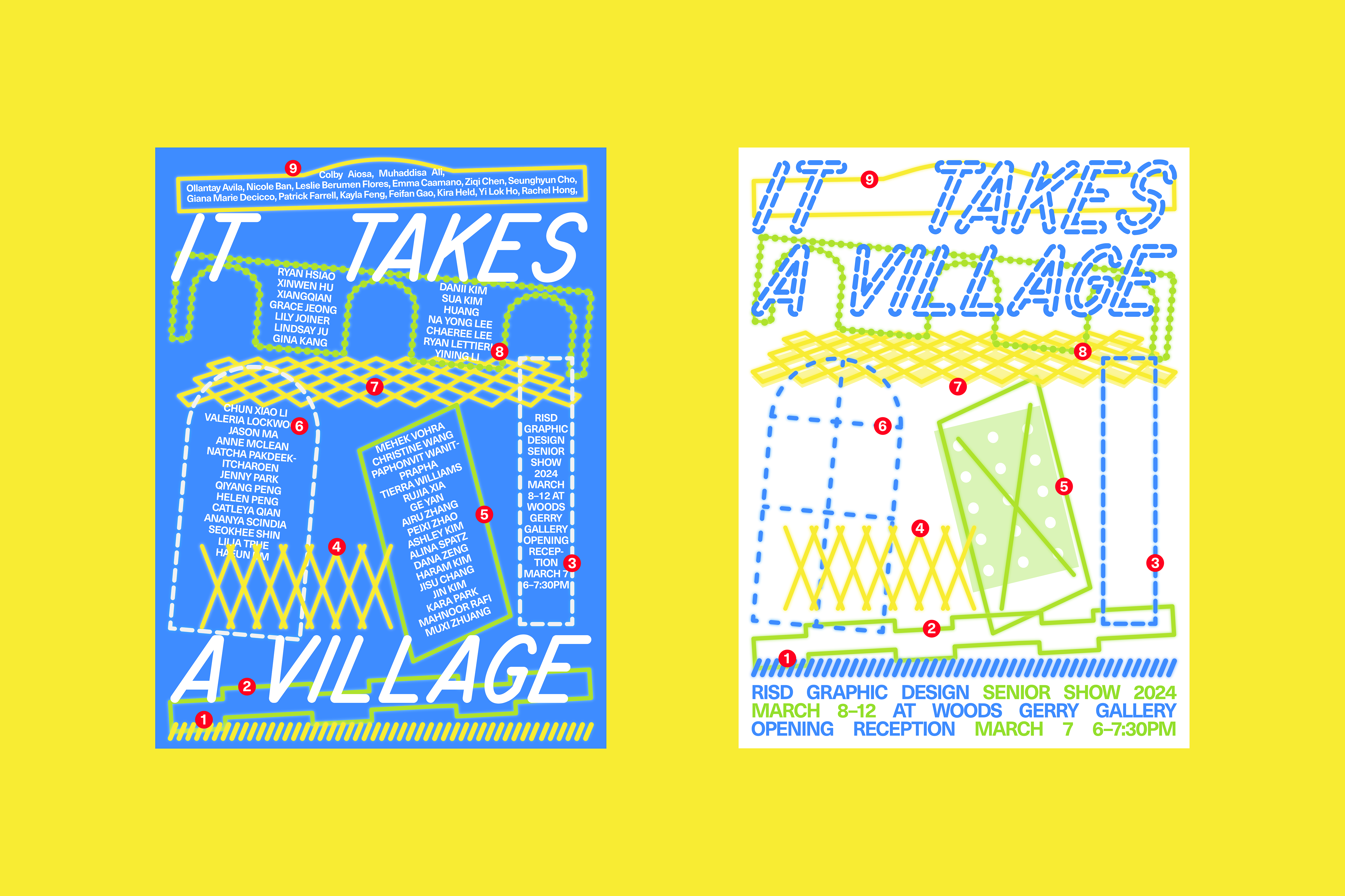 Co-organized Senior Show for RISD Graphic Design Class of 2024. Worked across various teams within the show to apply the visual language throughout multiple formats and applications. Worked as part of leadership team and co-led identity and exhibition teams at the same time. Routed Gothic and Unica 77 in use.